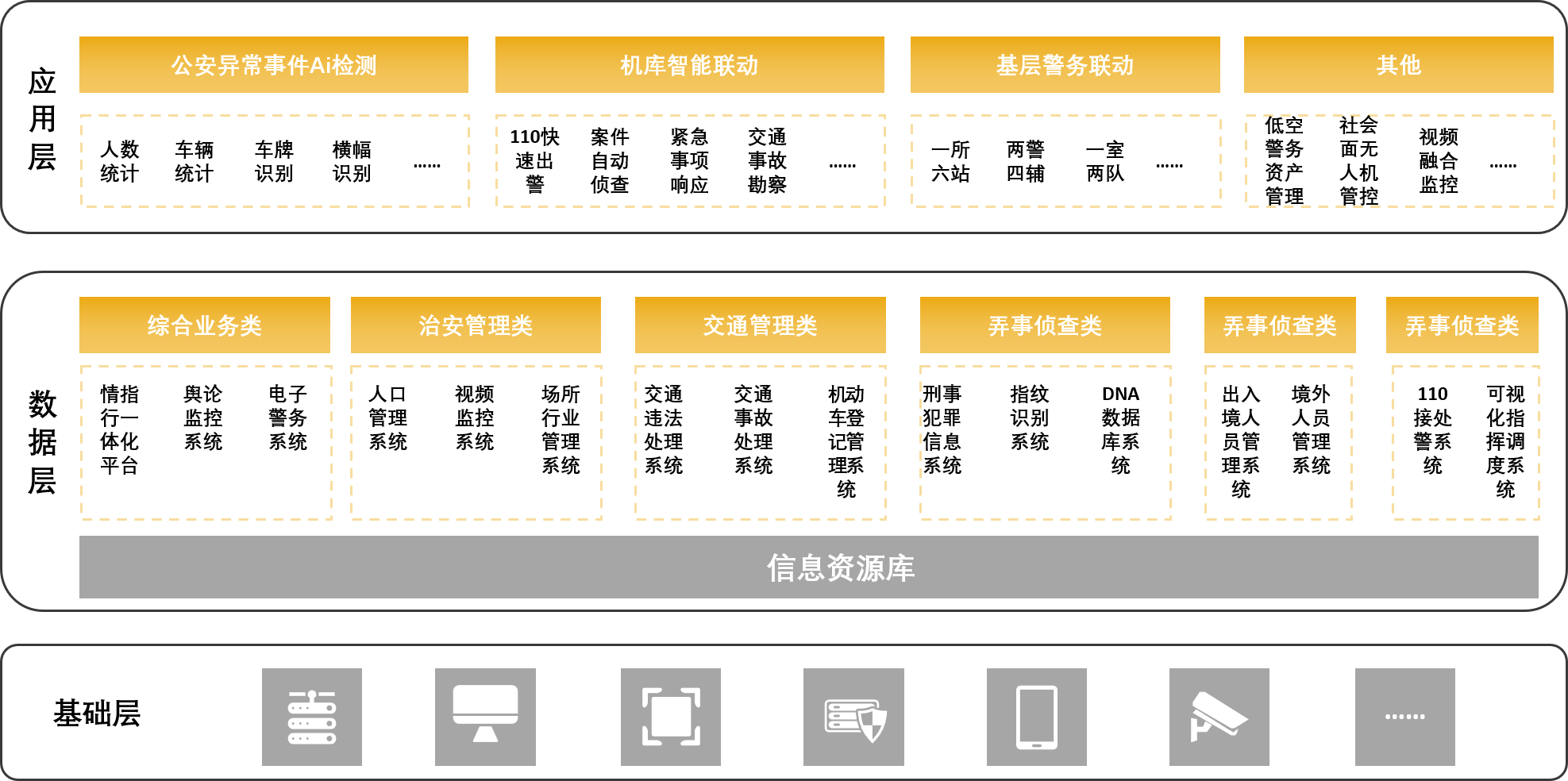 前端通过公安异常事件AI检测实现立体化监测与智能识别;依托机库智能联动实现突发事件的快速响应与智能调度;通过基层警务联动将能力下沉至实战单元,赋能一线警务。全过程由综合业务类系统与信息资源库提供数据支撑与业务协同,形成“前端感知、后端研判、一体联动”的公共安全处置体系,最终实现精准指挥与科学决策。